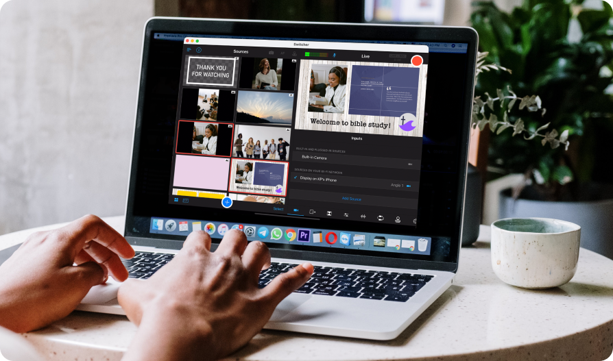 Switcher on Mac includes the full production experience: multi-camera switching, graphics, screen sharing, remote guests, multi-streaming, recording, and everything else you rely on for your live streams.
